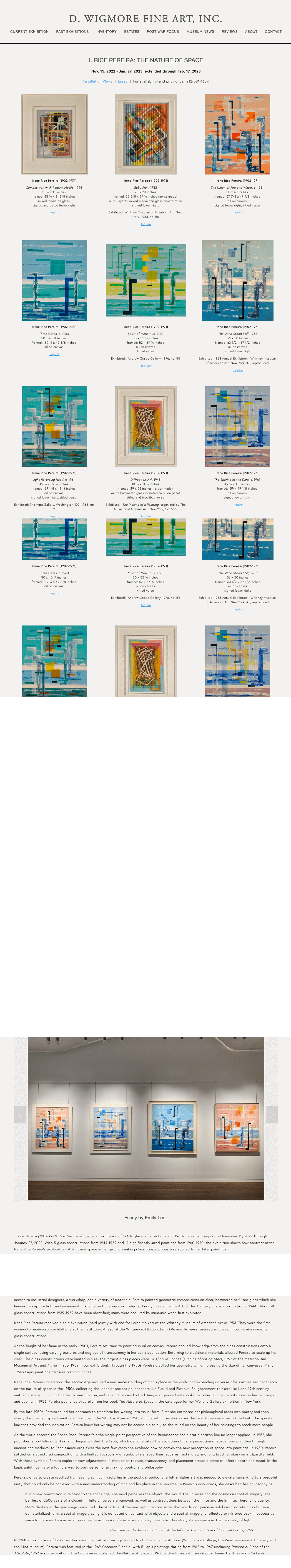 Three White Squares, a 1940 Pereira oil painting, was on exhibit at The D. Wigmore Fine Art Inc., 730 Fifth Avenue, New York City, in an exhibition called Explorations in Black and White: The 1930s through the 1960s. This painting has been reproduced frequently and was included in the seminal 1953 Loren MacIver/I. Rice Pereira restrospective at The Whitney Museum. The show continued through December 23, 2009.